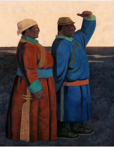 水彩画·粉画《远方》是一幅将细部的精美和整体的大气之美结合很好的佳作,也获得金奖。作品表达出草原牧民对美好生活的憧憬。只见朝阳以温暖的光线映照着天空和牧民,呈现一派祥和。画面以红、黄、蓝为主色调,具有很强的视觉冲击力,人物描绘得如同雕像般的敦实形象,表现出蒙古族牧民的坚强勇敢、深沉内敛、诚挚醇厚的品性。作品借用油画中“彩”的凝重法,在用彩和水上非常讲究,用笔比较含蓄,人物丰富的内心世界捕捉到位,艺术语言有着强烈的时代感和力量感。