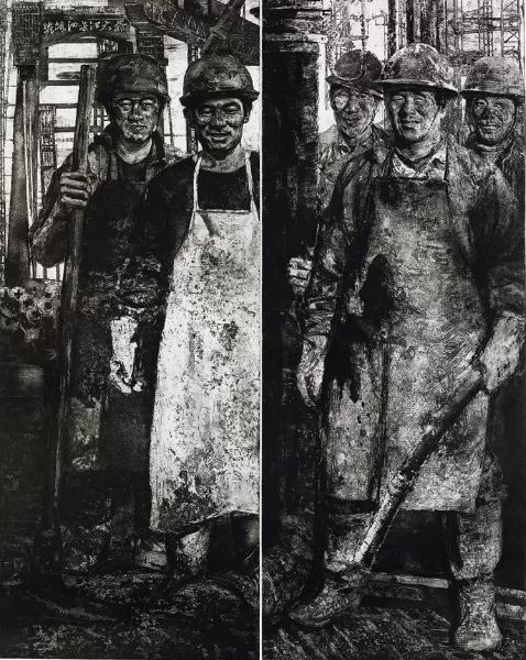 曹丹-《阳光下的大桥浇筑工》-湖北-版画