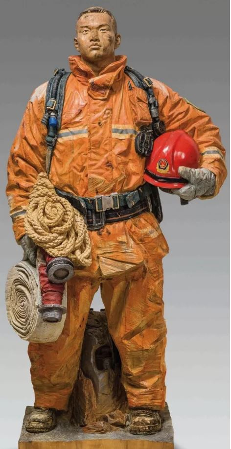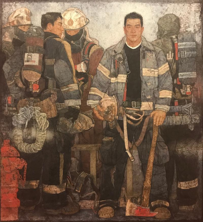 中国画《使命》是金奖作品,描绘了消防员们在灭火抢险后整装小憩的平静场景,他们疲乏中透露出坚毅和欣慰,安静地伫立在硝烟末烬的火场,等待着再赴险地的指令。作者李东旺说:“作品并没有那种动态激昂的文学化描述,我尽可能去掉那种史诗、传奇般的情绪渲染,着力体现真实的、未经过度美化的生命个体。在这个维度上,我们与英雄变得亲切。成为英雄是一种选择。”中国美协中国画艺委会主任龙瑞说,《使命》在绘画语言上采用工笔重彩的方式,在写实造型的基础上,运用传统的骨法用笔,画面描绘细腻精致,在遵循严谨的人物解剖基础上进行主观变形,魁梧的身躯,配以蓝灰黑色,使人物展现出较强的雕塑感,用丰碑式构图法,视觉冲击力较强。