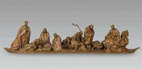 铜奖雕塑作品《艺舟扬四海》是本届全国美展中“写意”雕塑的代表作之一,反映了近年来我国雕塑家在寻求当代雕塑民族化发展道路中所进行的探索,这是一种基于全球化视野下民族自觉的文化诉求。但见一叶扁舟,八位高士,或抱琴独立、或倚石坐卧、或对弈观棋、或阅卷览画,他们沉着坚毅、智慧灵明、高古超拔、勇猛精进、神情飞扬、姿态各异,整个场景设计暗合“琴棋书画”的中国传统文化表征。人物间以太湖石勾连,空灵通透、聚散错落、别有韵致。作者尚荣用写意雕塑的手法塑造了一组求真求法的修行者、传播者的形象,将中国传统写意绘画中不求工细、注重传神写照的笔墨语言融入到雕塑的造型中,吸收中国传统园林中的山石造型和水韵肌理,塑造了一个个穿越遥远时空的高古形象,在起伏错落的人物关系中蕴含着高山流水的音乐感,具有一派山林之气、意象之风。