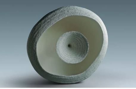 陶瓷作品《暧昧》获得了铜奖。使用陶艺最古老的泥条盘筑技术,并改用瓷泥创作,型制硕大,将盘筑的语言用到极致,高超的技艺形成单一而又富有魅力的质感肌理,视觉新颖而“传统”。作品在容器的底部中心出人意料的生长出一个“喷泉”状的形态与外围器口形成呼应,使作品的内外空间具有巧妙的视觉互移,也使作品在容器与抽象雕塑中进行了转换。据作者王杰介绍,由于该作品的创作方式与体量所产生的高强度工作量,迫使他进入沉浸式的创作状态,在身体疲劳麻木过程中,手在逐渐以身体本能而运作,个人的精神能量与材料共同协作、相互感受。这是一个暧昧的过程,是作者与作品默契形成的过程。这也是取名《暧昧》的原因。
