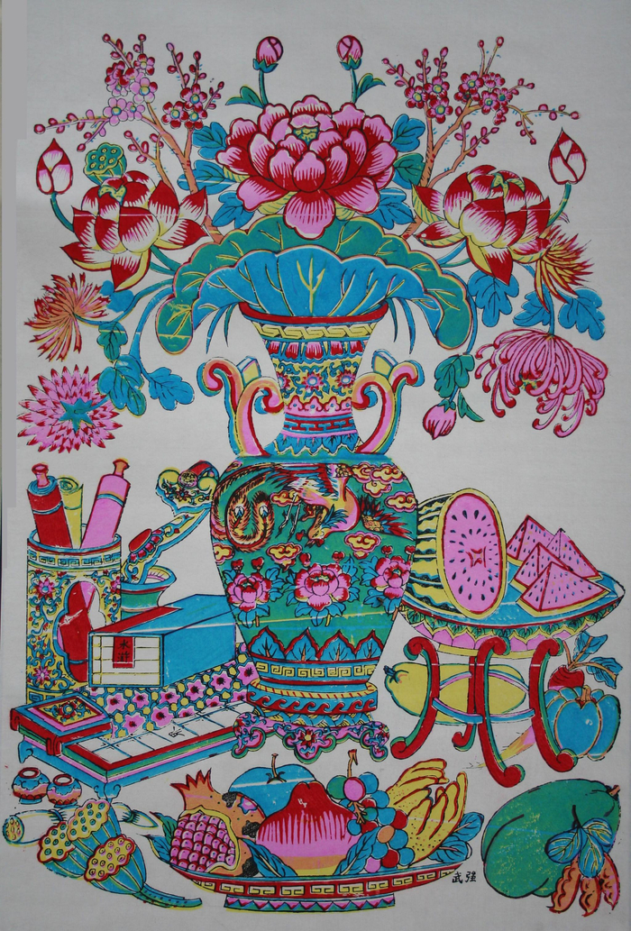大花瓶年画,花瓶代表平安,牡丹花象征富贵,瓶中所插的牡丹花、荷花、菊花和梅花象征一年四季平安富贵。果盘中的寿桃、佛手、广柑、葡萄和切开的西瓜,表示多子、多福、多寿。受访者供图