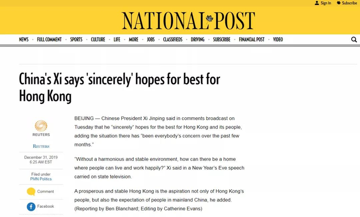 加拿大《星报》(The Star)以《习近平新年贺词希望香港稳定》为题,对习主席的新年贺词进行了报道,并援引了习主席贺词中的希望香港稳定的内容。