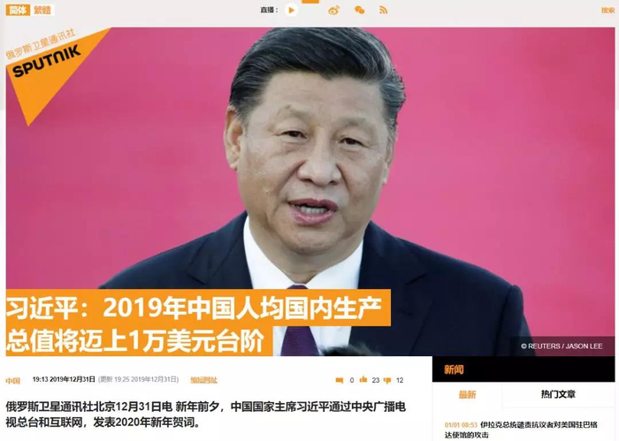 习近平主席的新年贺词同样引发俄罗斯媒体的关注。俄罗斯卫星通讯社的文章称,习近平在新年贺词中提到“2019年我国国内生产总值预计将接近100万亿元人民币、人均将迈上1万美元的台阶”。
