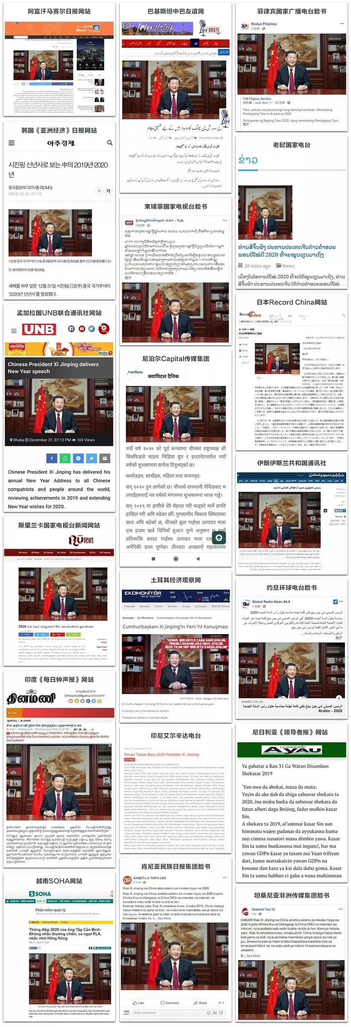 中央广播电视总台国际视频通讯社播出的习近平主席新年贺词讲话视频节目被美国葡萄牙语电视台 Globo TV International、美国广播公司旗下WBKO电视台、意大利TGCOM 24电视台、意大利TG5电视台、加拿大安大略省市电视台CHCH、匈牙利ATV电视台、日本NHK、韩国KBS、半岛电视台等17个国家和地区的28家境外电视台/频道等转发。