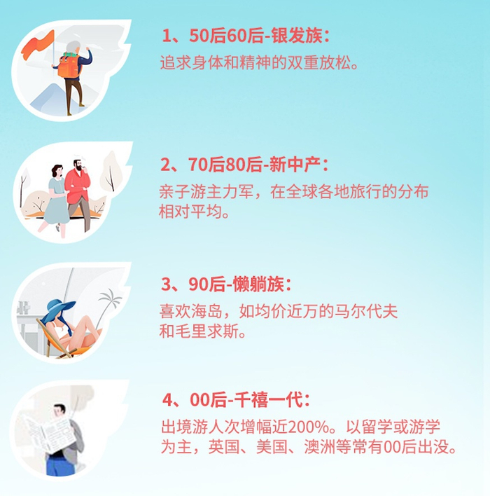 根据飞猪的消费洞察,不同年龄段的消费者之间,存在明显的旅游偏好差异。其中,80后是亲子游主力军,在全球各地旅行的分布相对平均;90后最爱海岛旅游,马尔代夫和毛里求斯最受90后欢迎;00后普遍在念书阶段,出境以留学或游学为主,英国、美国、澳洲等是主要目的地。