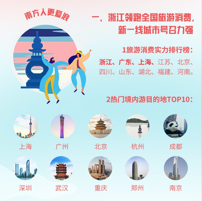 飞猪数据显示,浙江问鼎旅游消费实力排行榜榜首,广东、上海、江苏、北京、四川、山东、湖北、福建、河南为第二至第十位。前十名中,南方省份占据七席,南方人更爱出去旅行。
