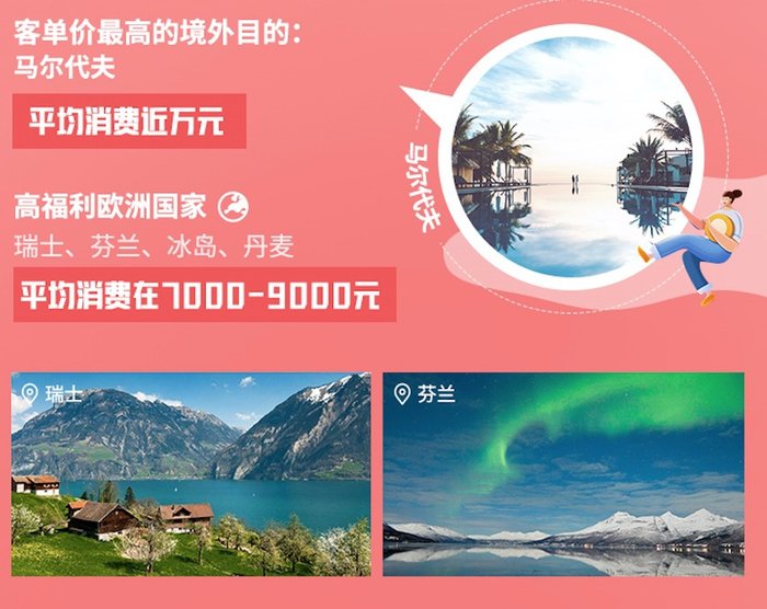 出境游的花费上,国人也越来越大方。飞猪数据显示,2019年出境游消费同比增长超25%。奢华酒店密集的马尔代夫是国人平均花费最高的目的地,路途遥远的非洲加纳、坦桑尼亚、尼日利亚,以及欧洲的冰岛、瑞士、丹麦都是花费较高的目的地。