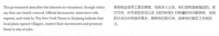 类似的描写还有很多,总之,《纽约时报》用了三分之一左右的篇幅,从各个角度描写新疆少数民族人民的就业行为是“被迫”的。