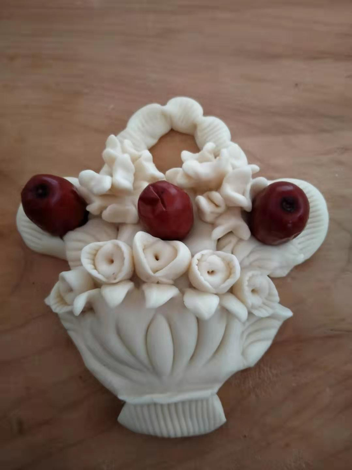 “那是用于庆祝重大活动制作的,春节不做。”丁芳莲说,“春节蒸的面花主要是‘枣山’‘面羊’‘饭山’等。”每个重量都在2斤以上,也是最考验面花匠人组合设计能力的几种大型面花。其他小型单款花馍有佛手、石榴、莲花、桃子等,动物造型则是老虎、兔子、鱼等。