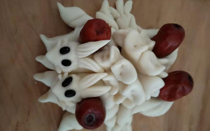 其中,“枣山”在制作上,需要在一块三角形面饼上铺上红枣。红枣,寓意早早翻身、早早发财。红枣上叠放面饼的同时,增加独特寓意的单款花馍,比如符合春节气息的“小元宝”、“钱龙”、“鲤鱼”、“兔子”等。据她介绍,枣山这种面花主要分布在黄河中下游的陕西、山西、河北等地。