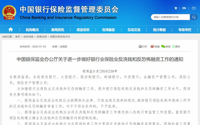 新京报讯 中国银保监会官网1月3日消息,为加强银行业保险业反洗钱和反恐怖融资工作,提升银行保险机构反洗钱和反恐怖融资工作水平,现将有关事项通知如下: