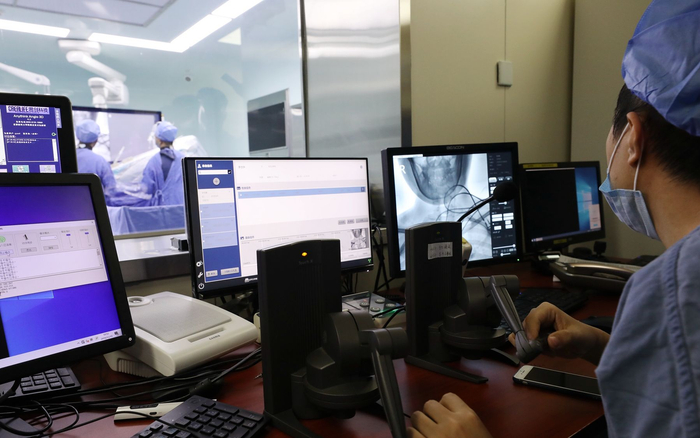 医生通过远程遥控手术机器人“鲁班”,实施了对患者动脉血管的造影手术。北京天坛医院岳朴供图