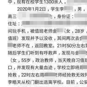 一张疑似涉事学校关于此事的情况报告截图显示,1月2日 该校高三男生李某因晚自习玩手机,被值班老师金某发现并予以没收,之后李某两次去金某办公室要手机,因金某不在,返回教室,李某第三次进到办公室后,学生们听到呼救声,发现与金某同一办公室的55岁女教师周某娟倒在办公室门口,有大量血迹,周某娟随即被送往附近医院,经抢救无效死亡。监控显示事发后李某从校门翻出逃离。