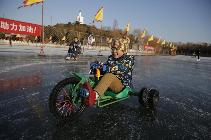 有着“冬宫”美誉的北海曾是清代冰嬉表演的重要场所之一。今天,北海公园冰场正式迎客,一开放就迎来了众多前来过周末的游客。不少家长带着孩子坐上冰车“驰骋冰场”,冰上自行车也格外受到游客的青睐。