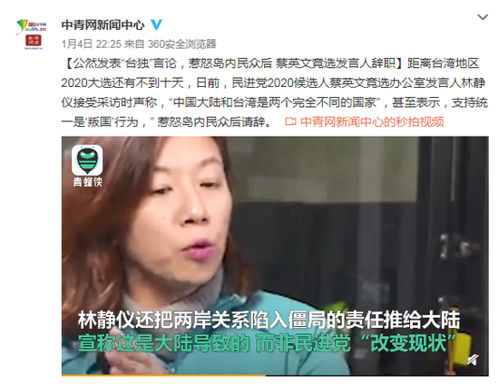 距离台湾地区2020大选还有不到十天,日前,民进党2020候选人蔡英文竞选办公室发言人林静仪接受采访时声称,“中国大陆和台湾是两个完全不同的国家”,甚至表示,支持统一是‘叛国’行为,” 惹怒岛内民众后请辞。
