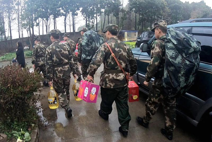 1月3日,紧张疲劳的冬季拉练第二天,得知抗美援朝老兵蔡根清老人就住在行军沿途附近,刚刚在雨天完成25公里徒步行军的总队官兵代表不顾疲劳酸痛,就地采购慰问品,特地登门拜访,为老人带来新年的祝福。