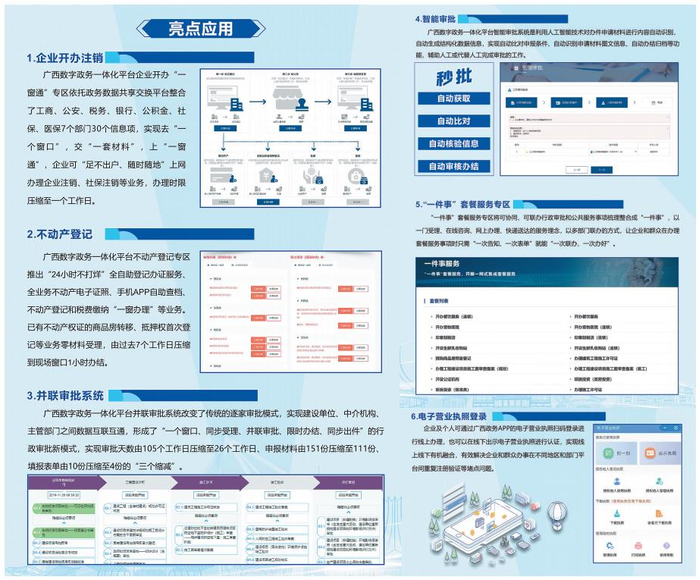 当前,广西“工程项目报建”的“信息化”并联审批,实现了工程报建审批时间从105个工作日压缩至26个工作日、申报材料由151份压缩至111份、填报表单由10份压缩至4份的“三个缩减”。不动产登记、企业开办注销实现“1个工作日”办结,达到全国一流水平。