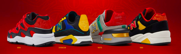 New Balance的新年系列主题为“齐开新局”,共推出4款鞋,分别为X-RAER、997S、850、580,配色各不相同,但红色和金黄色偏多。最吸引眼球的是鞋跟上的龙、狮、貔貅等瑞兽图案,寓意美好,春节氛围浓厚。另外,New Balance Kids联合设计师品牌TYAKASHA推出了3款儿童鞋,将小老鼠图案与红色剪纸结合。
