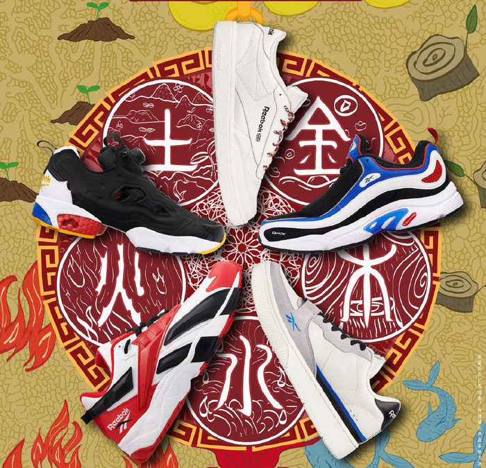 Reebok的创意别出心裁,推出了代表金、木、水、火、土的五“型”鞋,分别对应Club C、Daytona、Dual Court、Interval、Instapump Fury鞋型,同时Reebok赋予了这些鞋与传统五行不同的白、青、黑、红、黄配色。