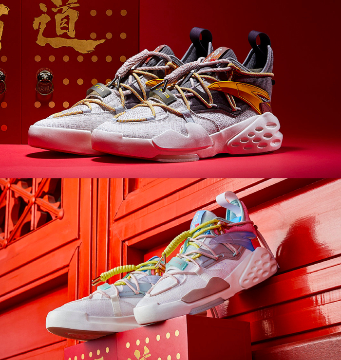 安踏目前推出了两款“霸道”系列新年限定鞋款,两款鞋的配色方案源自故宫的两个藏品,以仙鹤为灵感,寓意“瑞鹤吉祥”与“富贵如意”。鞋舌与鞋底均印有“霸道”二字,鞋面印有万字纹图案,古朴与前卫相互交融。