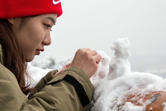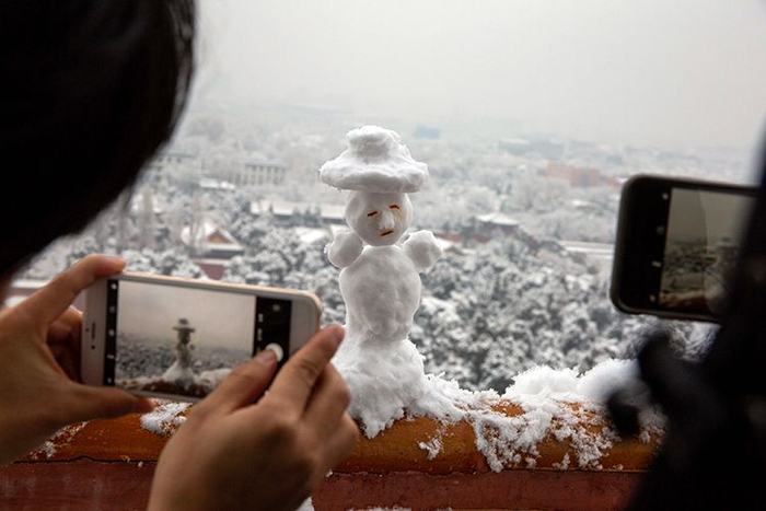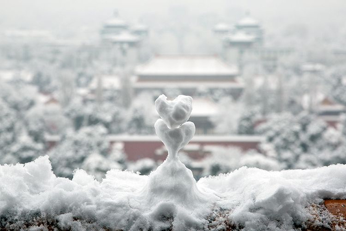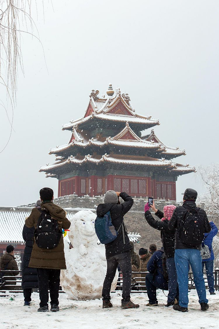 故宫角楼外堆起大雪人,打卡美景的市民络绎不绝。