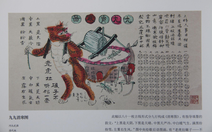 “一九二九不出手,三九四九凌上走,五九萌芽生,春打六九头,七九河开河不开,八九雁来雁准来,九九加一九,耕牛遍地走。”武强年画博物馆资料记载,这幅由王兴邦创作的年画《九九消寒图》,首次镶刻了“九九消寒歌”。“应该是80年代左右创作的。”武强年画博物馆研究室主任陈贺芝介绍,“‘不出手’就是天气冷了,冻得手不能伸;‘凌’就是冰凌,‘三九四九’结冰比较厚,可以在河上行走;到了‘五九’,草要发芽了;而立春一般在‘六九’之前或刚开始,称为‘打春’;往后河水慢慢化开,南雁北归,春暖花开,可以耕地了。”