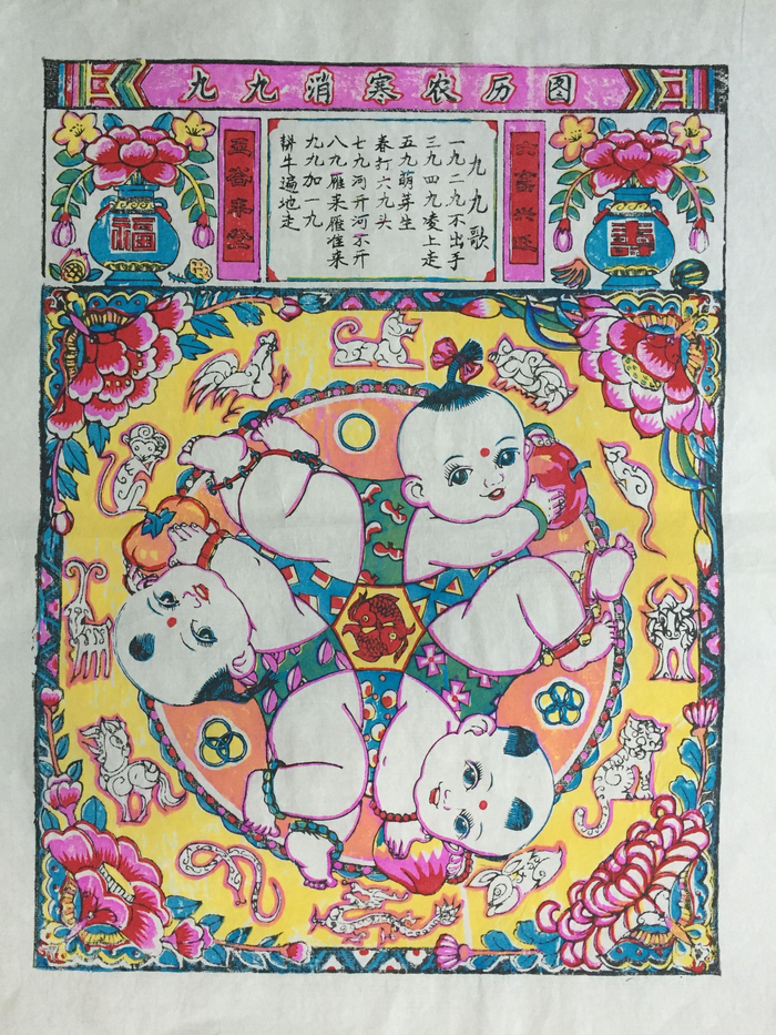 年画主体是武强年画的传统图案“六子争头”,即六个小孩共用三个头。“在我们口语中,‘头’又有第一的意思,争头也是争第一,表达了一种积极向上的心态。”陈贺芝介绍,这一图案只会在《九九消寒图》中出现,80年代改良的版本,也是从清朝古版中截取的图案。