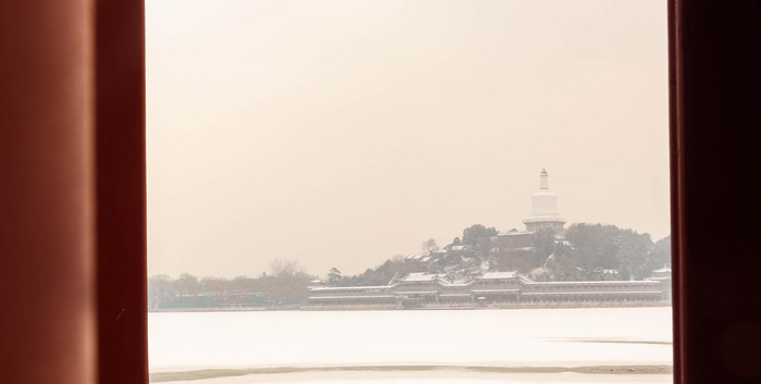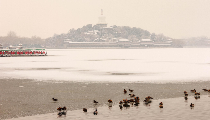 北海公园冰面被白雪覆盖。