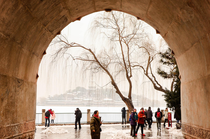 什刹海附近游人赏雪。