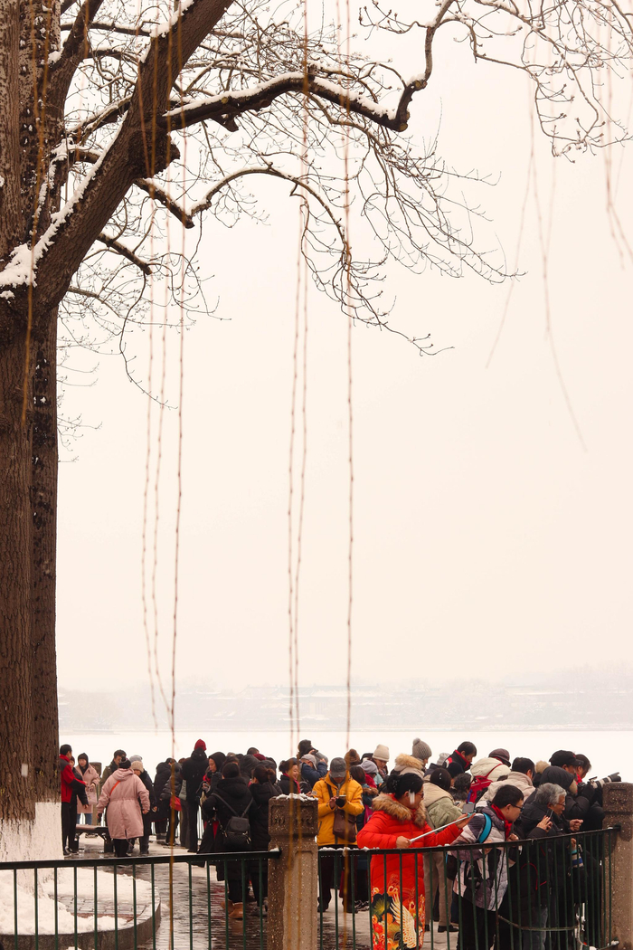什刹海附近游人拍雪。