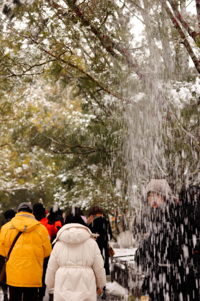 北海公园赏雪的游客众多。