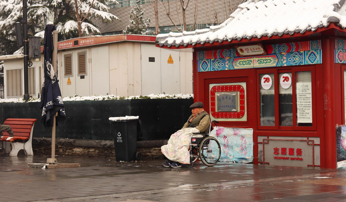 荷花市场一老人看远处的雪景。