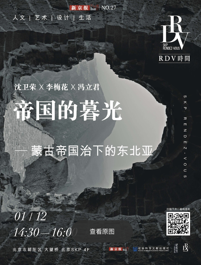 1月12日,新京报·文化客厅第二十七场联合社科文献出版社·甲骨文、SKP RENDEZ-VOUS,邀请清华大学教授沈卫荣、《帝国的暮光》译者李梅花、陕西师范大学历史文化学院暨东亚历史研究所研究员冯立君,一同将目光聚焦到元帝国衰亡时刻的边缘故事。