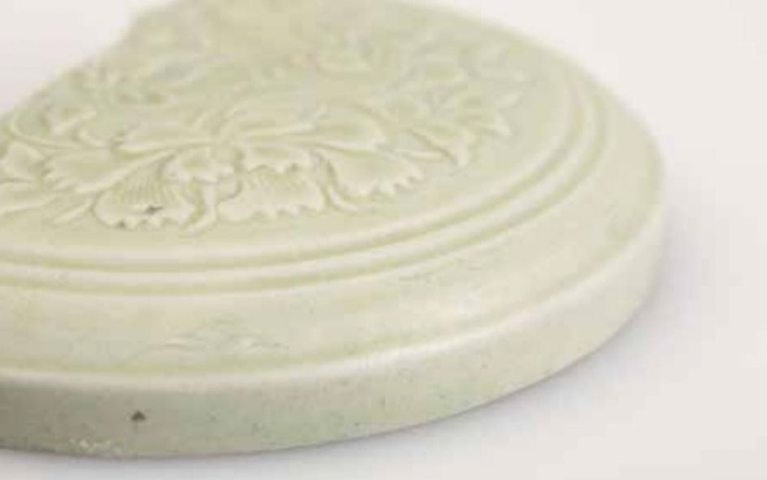 越窑粉盒盖的残片,拥有温润内敛的翠绿釉色以及克制的印花纹饰,是越窑釉色与质感的代表。