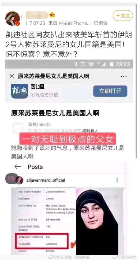 其中最令人匪夷所思的一个谣言是这样:中国网友扒出惊天大消息,苏莱曼尼的女儿竟然是美国籍!