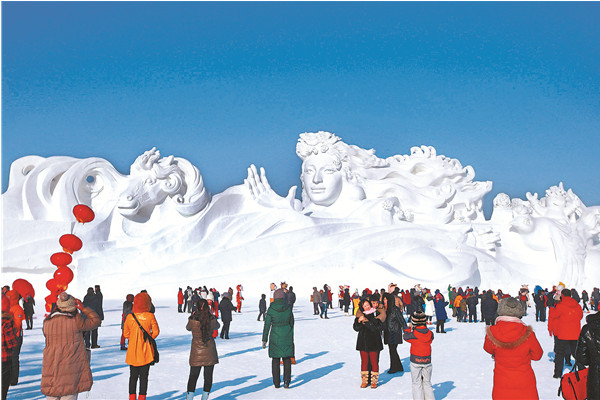 大型雪塑如梦如幻,向八方游客展示着哈尔滨冰雪文化的独特魅力。哈报资料片