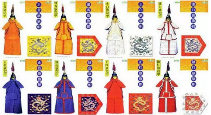 1601年,努尔哈赤把他的部众每300人编成一个单位,称作牛录,最初只有四个牛录,分别以红、黄、蓝、白颜色的旗作为标识。来归的人越来越多,牛录的数目也增加,分别被纳入四个旗下。到了1615年,在原有的四旗之外,增设了镶红、镶黄、镶蓝、镶白四旗,红旗镶以白边,黄、白、蓝三旗均镶以红边,共为八旗。每旗下统五个扎拦