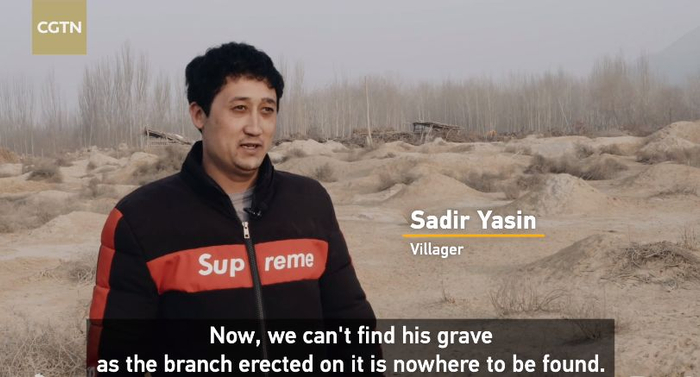 萨迪尔的爷爷在他十岁那年去世,他的家人在当地土坟堆上下葬了爷爷。据萨迪尔回忆,他当时在爷爷的坟头竖了树枝,他小时候跟着父母去祭拜过几次,但之后再也找不到爷爷的坟墓了。