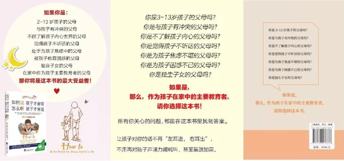 再接着看下去,咦,这段好像有点眼熟?在玛兹丽施的那本同名书文案里似乎也见过?“与孩子有冲突的父母”、“不了解孩子内心的父母”、“觉得孩子不听话的父母”、“为孩子焦虑不堪的父母”、“为孩子困惑不已的父母”、“独生子女的父母”,看起来都和之前的文案“英雄所见略同”呢?真是花样迎合了当下中国父母家庭教育中的心理诉求。