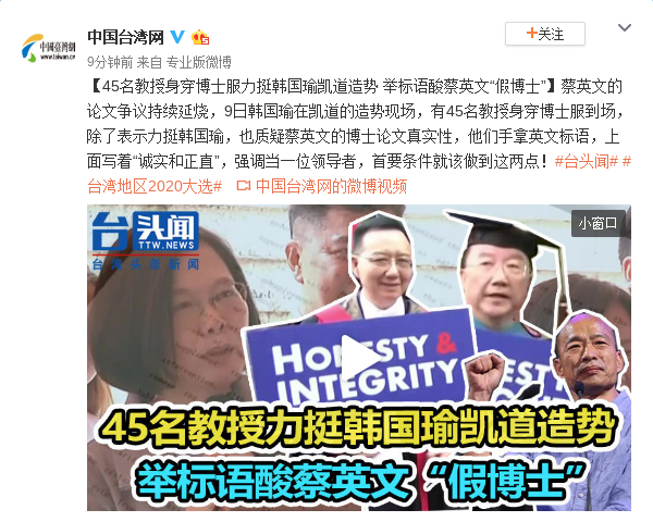 蔡英文的论文争议持续延烧,9日韩国瑜在凯道的造势现场,有45名教授身穿博士服到场,除了表示力挺韩国瑜,也质疑蔡英文的博士论文真实性,他们手拿英文标语,上面写着“诚实和正直”,强调当一位领导者,首要条件就该做到这两点!