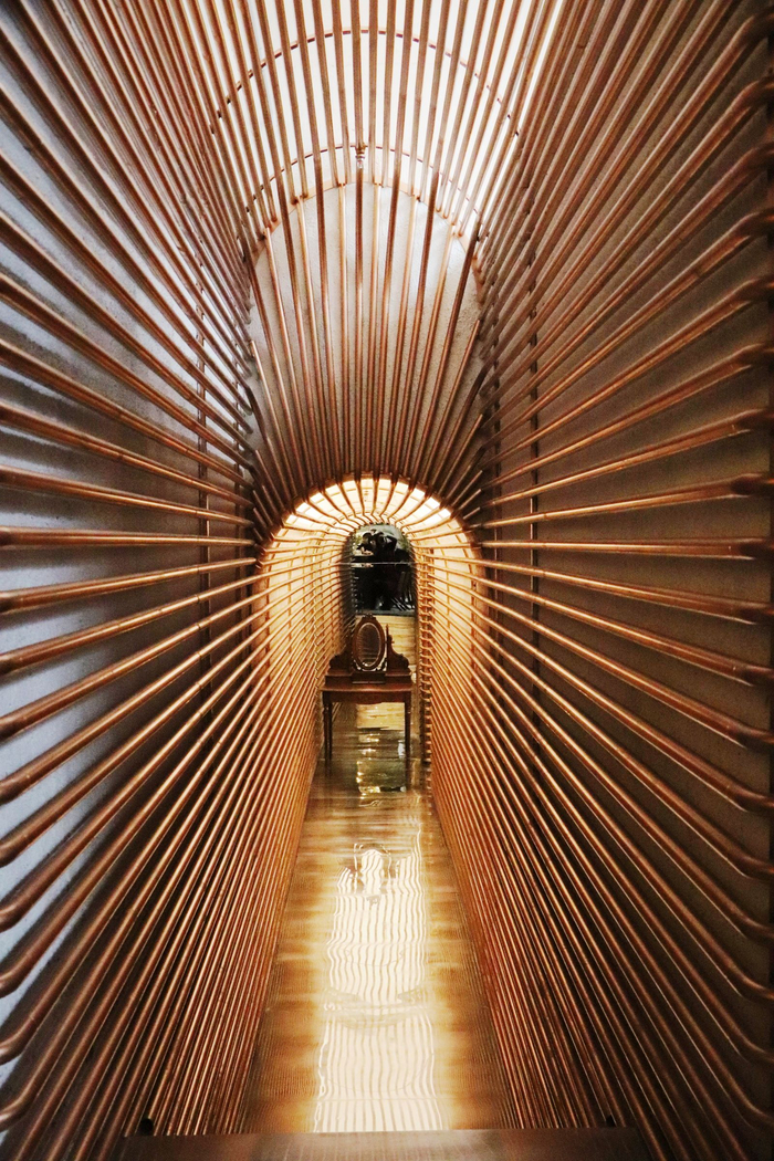 △一条由上百根红铜管制作的“时光隧道”,将咖啡馆和独立餐厅相连。