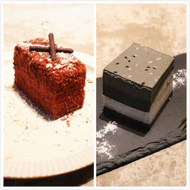 5款甜品藤黄无花、赤朱、樱草、赭石、青墨,取名源于中国传统颜料。赤朱是山楂馅,撒上椰蓉碎,上面装点着冰片,如同故宫的“红墙染雪”。赭石实际是巧克力抹茶红豆蛋糕,星星点点金箔点缀平添一份美感。