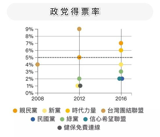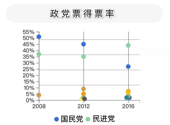 从历届政党票得票率中,可看到国民党与民进党获得大多数选票,其余小党选票皆不到10%。