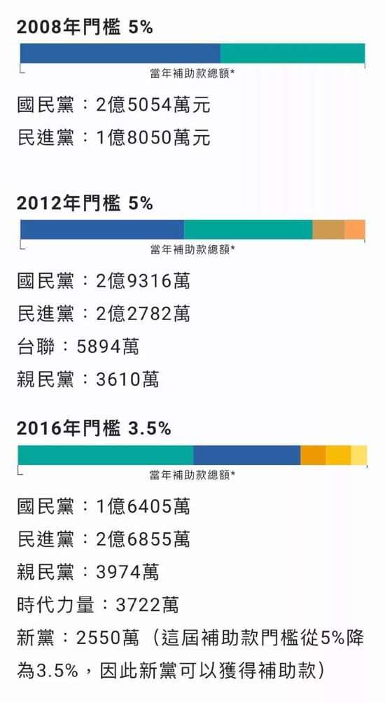 政党补助款:得票率达门槛的政党,“立委”4年任期内每年每票皆可获得50元的补助款。近几届选举具体补助金额如下: