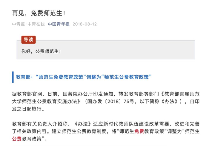 2018年8月,国务院办公厅印发通知,转发教育部等部门《教育部直属师范大学师范生公费教育实施办法》(国办发〔2018〕75号,以下简称《办法》),自印发之日起施行。