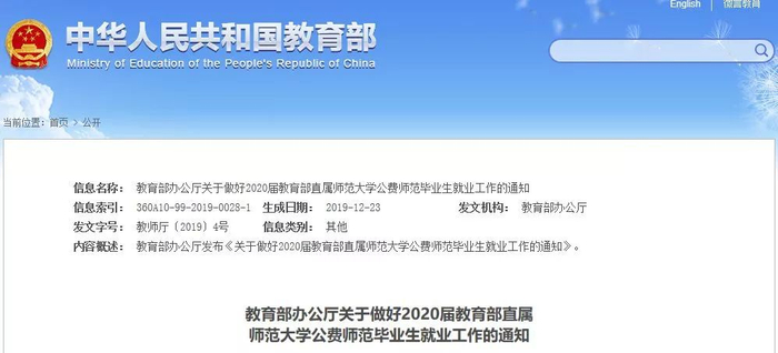 日前,教育部办公厅印发关于做好2020届教育部直属师范大学公费师范毕业生就业工作的通知,要求保证2020届部属师范大学公费师范毕业生全部安排到中小学校任教。