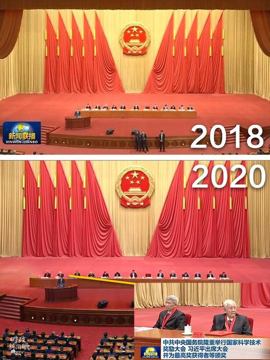 变化二:国家最高科学技术奖获得者坐到了主席台。在颁奖现场,习近平同两位国家最高科学技术奖获得者热情握手表示祝贺,并请他们到主席台就座。这一新的安排也是从去年开始的。