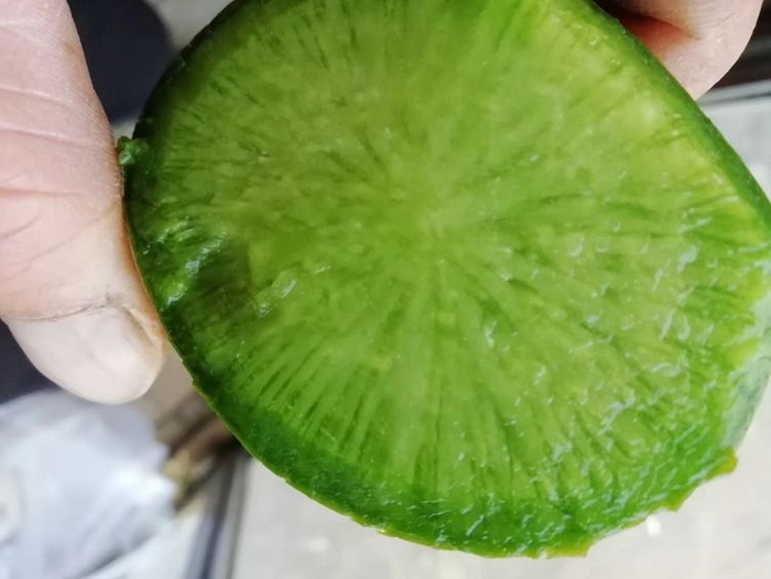 记者注意到,李祥金种植的青萝卜属于细长型,打开后,外皮呈现青绿色,里面则是浅绿色,“种植青萝卜的地方有很多,但多是比较短、比较粗一些的,细长的形状应该算的东夏庄青萝卜的一个特点,好一点的萝卜,表皮是很光滑的”。