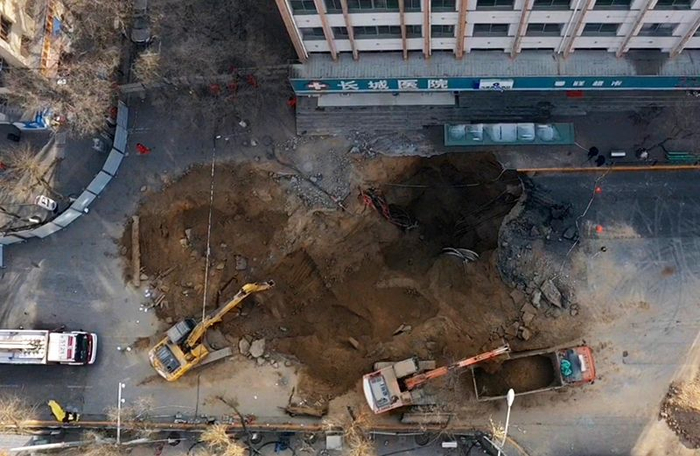 8时12分,青海省西宁市城中区路面塌陷现场,救援人员持续救援。